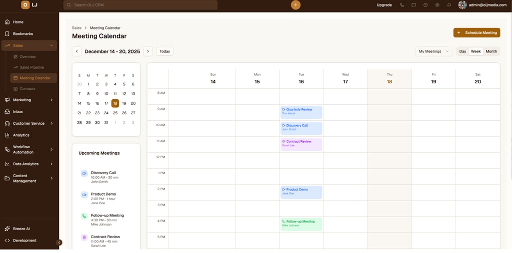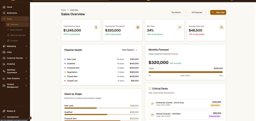 One of the strongest advantages of OLJ Media CRM is how clearly it shows your sales performance. From total pipeline value and win rate, to monthly forecasts and critical deals , everything is visible in one place.